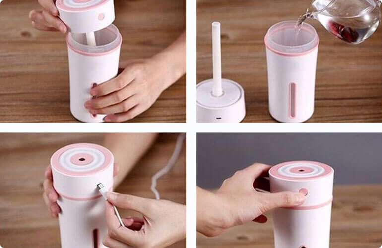 - Setup: Simply twist off the top, fill it with water, and press the button to start.